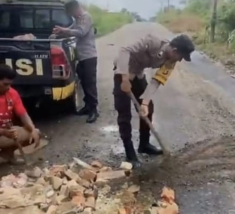 “Benar, personel Polsek BTS Ulu Polres Musi Rawas melakukan pengecekan kondisi jalan sekaligus perbaikan sementara”. Dengan cara menimbun lubang jalan menggunakan batu sebagai langkah antisipasi kecelakaan,” terang Kapolsek.